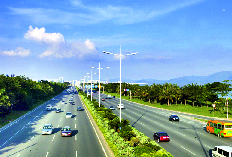 濱海大道工程?hào)|起廣深高速公路西側(cè)濱河大道立交處,西至南山區(qū)南油大道桂廟路口,為深圳市政總體規(guī)劃快速路系統(tǒng)西南環(huán)快速道路的重要組成部分。線路全長(zhǎng)9.66km,其中海域長(zhǎng)7.89km,陸地長(zhǎng)1.77km,設(shè)計(jì)路幅寬度海域段138m,陸域段97m,紅樹林段37m,東西雙向八車道,南北兩側(cè)各設(shè)雙向輔助車道和綠化隔離帶,南側(cè)加設(shè)防浪漿砌塊石海堤和人行休閑步道.濱海大道上設(shè)互通、半互通、跨線等八座立交橋,橋體全長(zhǎng)5.78m,并設(shè)有三座人性天橋、五座地下人行通道,與周邊的城市市政道路共同形成設(shè)施齊全、配套完善的城市快速交通路網(wǎng)。并與2000年12月獲廣東省優(yōu)質(zhì)樣板工程。最終獲得“金杯獎(jiǎng)”。