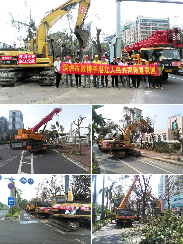 2015年10月4日,強(qiáng)臺(tái)風(fēng)“彩虹”從粵西登錄,夾雜著狂風(fēng)暴雨,導(dǎo)致湛江市區(qū)一片狼藉,10月6日晚23點(diǎn)左右,接深圳市住建系統(tǒng)領(lǐng)導(dǎo)通知指示,市政總積極響應(yīng),公司領(lǐng)導(dǎo)立刻做出安排,瀝青公司出動(dòng)CAT挖機(jī)一臺(tái),拖車一臺(tái),安裝公司出動(dòng)CAT挖機(jī)一臺(tái),于7日凌晨1:30分左右,從光明及石巖出發(fā),日夜兼程,第一時(shí)間到達(dá)指定集合地點(diǎn),并與當(dāng)?shù)貙?duì)接部門城市綜合管理局相關(guān)現(xiàn)場(chǎng)負(fù)責(zé)人員取得聯(lián)系,等候統(tǒng)一安排。