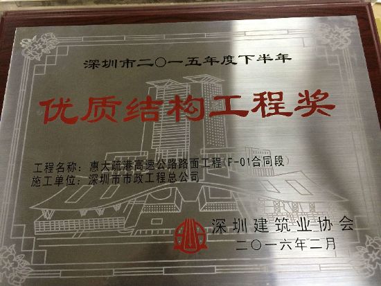 由深圳市市政工程總公司組織施工的惠大疏港高速公路路面工程(F—01合同段)榮獲2015年度下半年深圳市優(yōu)質(zhì)結(jié)構(gòu)工程獎(jiǎng)。