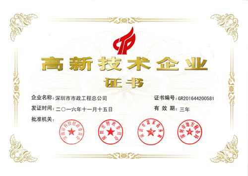 時至2016年年底,市政總公司又有喜訊傳來:在全國高新技術企業(yè)認定管理工作領導小組辦公室公示的2016年第一批擬認定高新技術企業(yè)名單中,深圳市市政工程總公司榜上有名,這預示著市政總公司將成為首家通過國家高新技術企業(yè)認定的深圳市屬建筑企業(yè)。這是天健集團及所屬企業(yè)值得高興和慶祝的喜事,標志著市政總公司在企業(yè)持續(xù)技術進步、升級轉型的發(fā)展歷程中,又邁上一個新臺階。