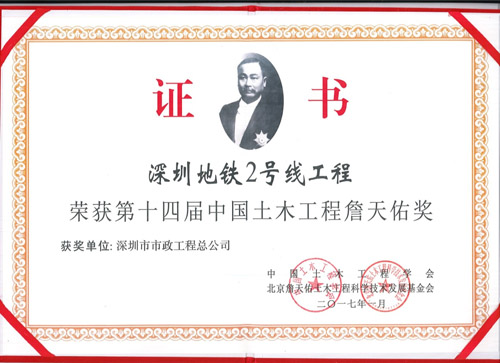 2017年4月14日,從北京傳來喜訊,深圳市市政工程總公司參建的深圳地鐵2號線工程榮獲第十四屆中國土木工程“詹天佑獎”,為公司的國家級獎項再添新榮譽。