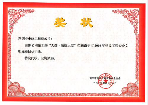 天健.領(lǐng)航大廈榮獲“南寧市2016年建設(shè)工程安全文明標(biāo)準(zhǔn)誠信工地”稱號(hào)