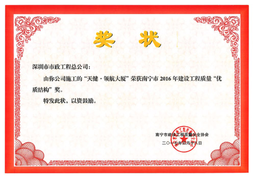 天健.領(lǐng)航大廈榮獲“南寧市2016年建設(shè)工程質(zhì)量優(yōu)質(zhì)結(jié)構(gòu)獎(jiǎng)”