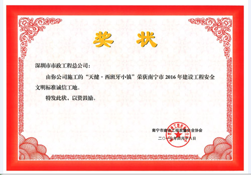 天健.西班牙小鎮(zhèn)榮獲“南寧市2016年建設(shè)工程安全文明標(biāo)準(zhǔn)誠信工地”稱號(hào)