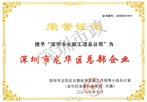 深圳市市政工程總公司獲龍華區(qū)總部企業(yè)榮譽(yù)證書