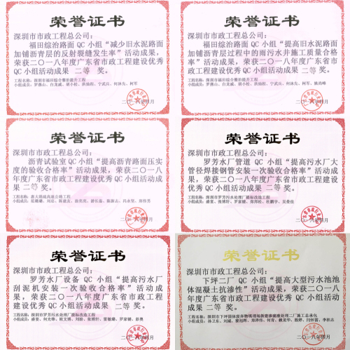 二等獎(jiǎng):《減少舊水泥路面加鋪瀝青層的反射裂縫發(fā)生率》、《提高舊水泥路面加鋪瀝青層過程中的雨霧水井施工質(zhì)量合格率》、《提高瀝青路面壓實(shí)度的驗(yàn)收合格率》、《提高污水廠大管徑焊接鋼管安裝一次驗(yàn)收合格率》、《提高污水廠刮泥機(jī)安裝一次驗(yàn)收合格率》、《提高大型污水池池體混凝土抗?jié)B性》