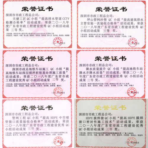 三等獎(jiǎng):《提高HDPE膜焊接口密封性施工技術(shù)》、《提高HDPE中空壁管接口質(zhì)量驗(yàn)收合格率》、《提高地鐵車站降水井降水質(zhì)量》、《提高建筑排水立管安裝一次驗(yàn)收合格率》、《提高地鐵車站深層攪拌樁軟基處理施工質(zhì)量》、《提高排水管道CCTV檢測合格率》