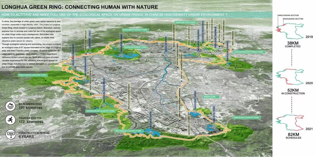 該項目以連接人與自然為理念,堅持生態(tài)優(yōu)先、自然恢復(fù)、適度介入的原則,鏈接了 7 個郊野公園,14 個水庫湖泊,15個景區(qū),40 處城市公園,打造“最自然、最生態(tài)、最有趣”的郊野綠道,形成環(huán)繞龍華全城的連續(xù)活力風(fēng)景帶,項目結(jié)合了各個片區(qū)的自然景觀,旨在彰顯人與自然的完美融合,包容大山大水與人文體驗。