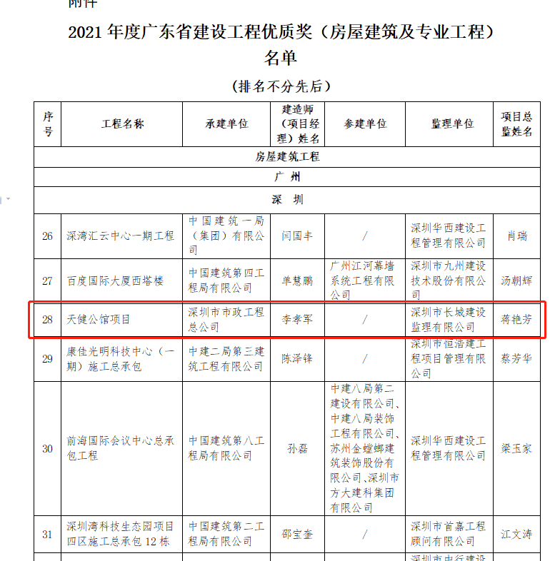 廣東省建設工程優(yōu)質(zhì)獎是廣東省建筑行業(yè)工程質(zhì)量的最高榮譽獎,由廣東省建筑業(yè)協(xié)會組織實施,每年評選一次。評選對象為中國建筑施工企業(yè)在廣東省境內(nèi)承包施工的,并已經(jīng)建成投入使用一年,其質(zhì)量達到省內(nèi)一流水平的各類工程。2021年度全省共有112項工程通過評審,其中深圳市有17項工程被評為2021年度廣東省建設工程優(yōu)質(zhì)獎。